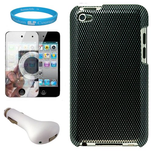 Carbon Fiber Protective Rubberized Crystal Hard Case Cover for Apple iPod Touch 4th Generation (8GB, 16GB, 32GB, 64GB) + Mirror Screen Protector for iPod Touch 4th Generation LCD Display Screen + USB Car Charger with LED Power Indicator and Overcharge Protection + SumacLife TM Wisdom Courage Wristband Feature