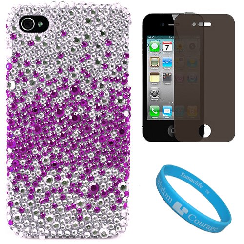 Silver with Purple Rhinestone Design Protective Two Piece Crystal Hard Case Cover for Verizon Wireless New iPhone 4 (16GB, 32GB) 4th Generation and AT&T iPhone 4 + 4-Way Film Privacy Screen Protector for Apple iPhone 4 LCD Display Screen + SumacLife TM Wisdom Courage Wristband Review